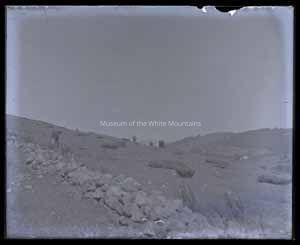 Black and white glass plate negative of a hillside. A stone wall runs across the foreground going back to the left. There are several rocks scattered on the ground and some low growing vegetation. Four cattle graze on the hill. A farm house is visible in the background.