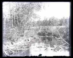 Black and white glass plate negative of a stream with a horse-drawn cart in it. In the foreground there are several broken branches in the stream. In the middleground there is a man driving a horse-drawn cart down the stream. There are several trees and bushes along the edges of the stream. The water is calm and shallow.