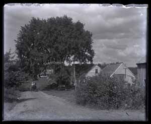Black and white glass plate negative of dirt road with houses on it. To the right of the road is a white Cape Code style house with barn. There is a large tree with a bench beneath it in the house's side yard. A man wearing a white jacket and straw hat drives a horse-drawn cart up the road; sitting beside him is a woman wearing a white dress and light-colored hat. In the background there is another house.