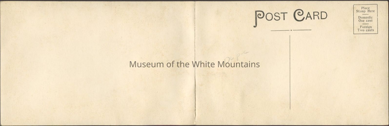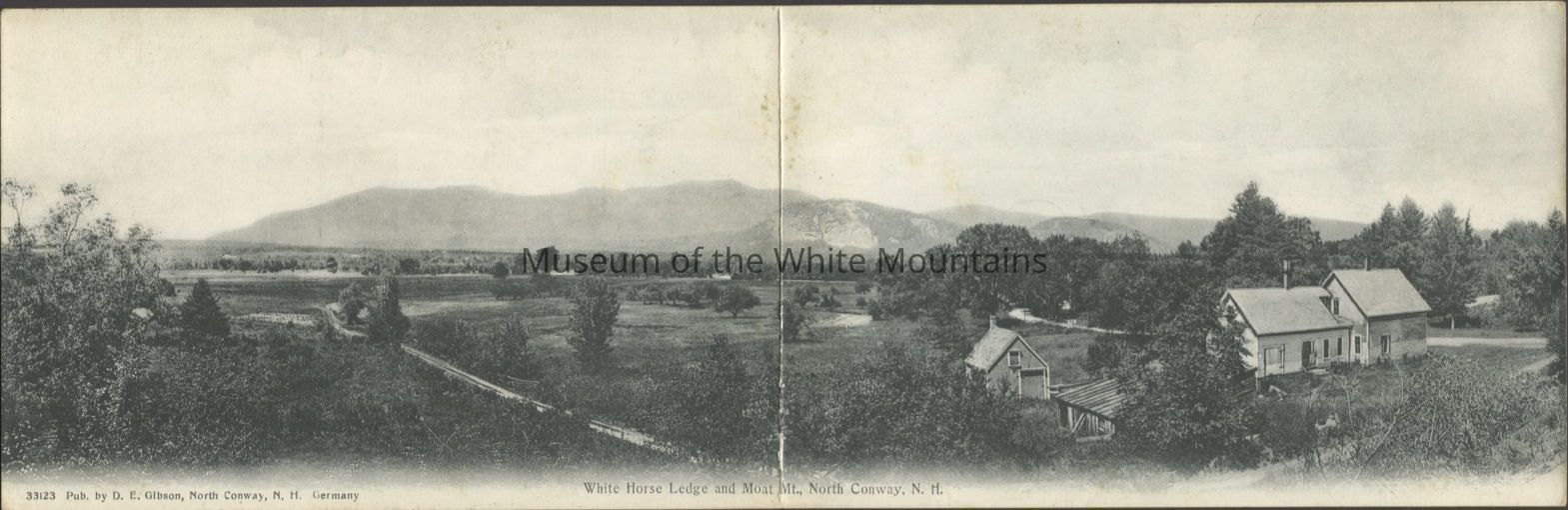 Black and white panoramic image of several houses and buildings, dirt roads and mountains. Caption reads, “White Horse Ledge and Moat Mt., North Conway, NH.”
