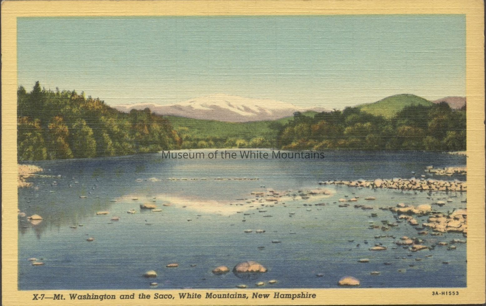 Colored image of a body of water with rocks in it, trees around it, and mountains in the background. Caption reads, "Mt. Washington and the Saco, White Mountains, NH.”