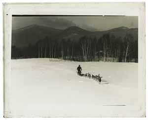 Black and white glass plate negative of a dog sled team. In the middleground there is a person on a dog sled being pulled by six dogs across a snow-covered hill. In the background there are trees and mountains.