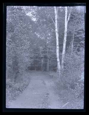 Black and white glass plate negative of a dirt road with vegetation on either side. There is a white birch tree to the right on the side of the road.