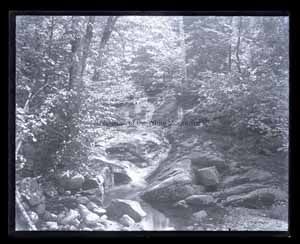 Black and white glass plate negative of a stream in the woods that flows over several rocks. There are several trees and other plants along each side of the stream.
