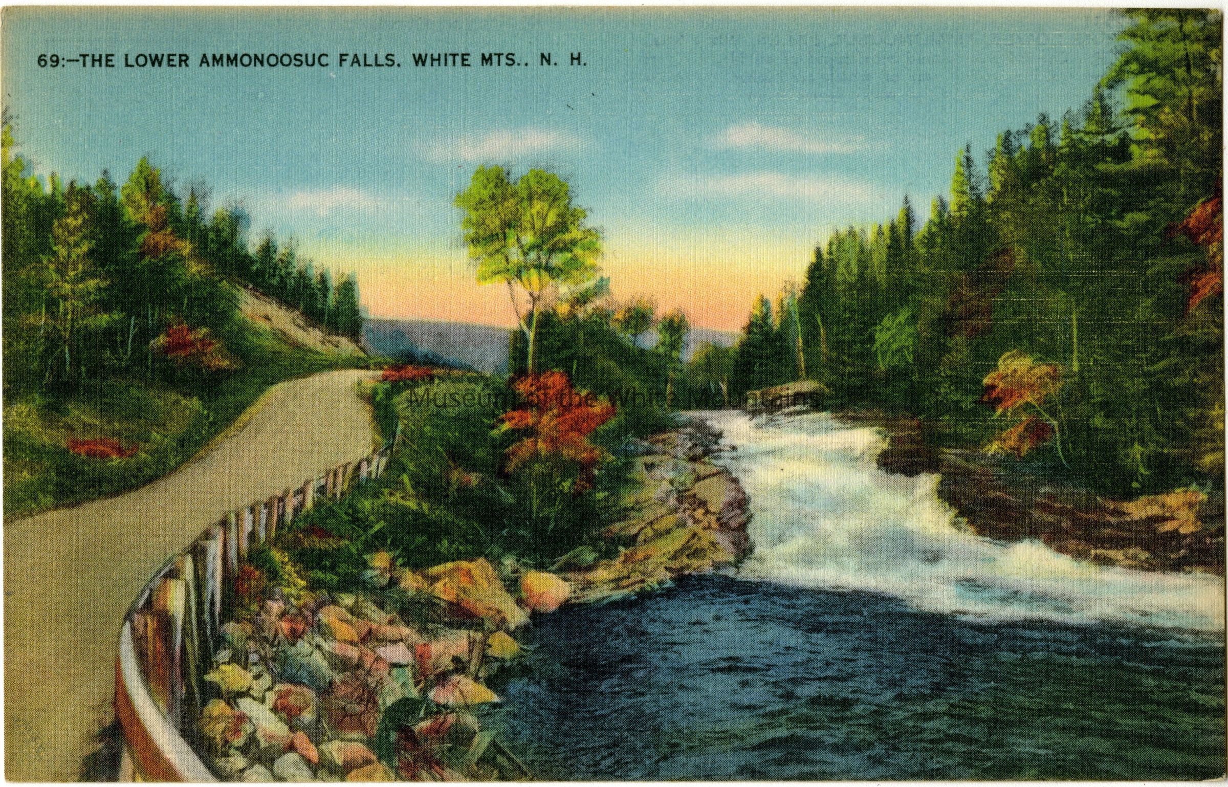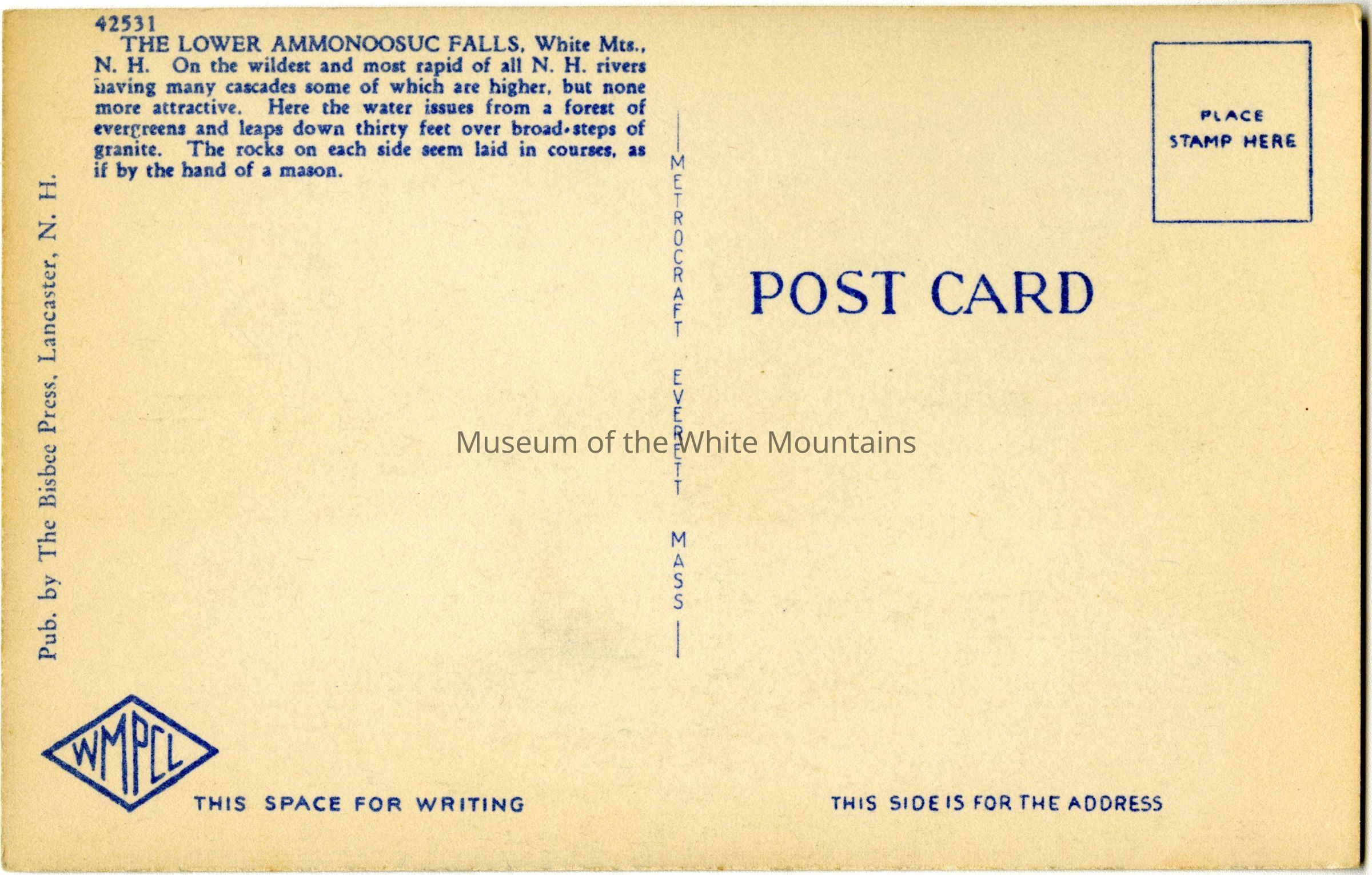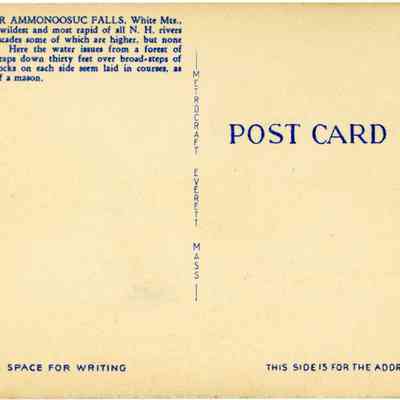 Divided back with this description of the falls: THE LOWER AMMONOOSUC FALLS, White Mts., N.H. On the wildest and most rapid of all N.H. rivers having many cascades some of which are higher, but none more attractive. Here the water issues from a forest of evergreens and leaps down thirty feet over broad-steps of granite. The rocks on each side seem laid in courses as if by the hand of a mason.