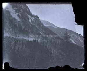 Black and white glass plate negative of mountain side. The slope of the mountain is covered with trees and snow. A road and telephone wires are visible in the center.