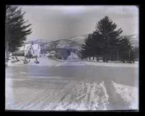Black and white glass plate negative of a snow covered road in North Conway. The road continues into the distance. There are wheel tracks visible in the snow on the road and several pine trees on each side. There are a few buildings on the left side of the road and mountains in the distance.