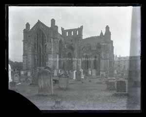 Black and white glass plate negative. Image is of a church and church graveyard. In the foreground of image there are many tombstones. Most of the image is taken up by a dilapidated church, which does not appear to have a roof or windows. In the background of the image there is a building that may possibly be a clergy house.