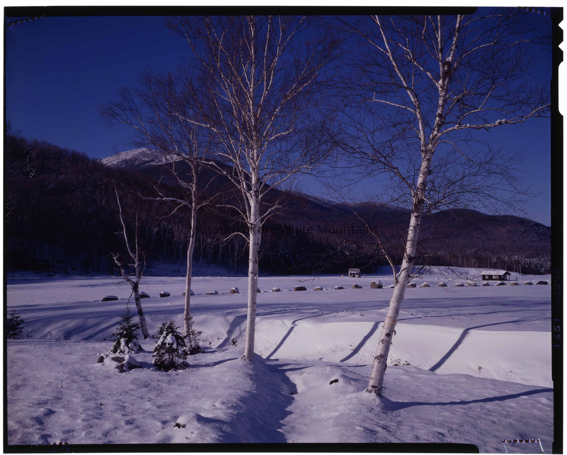 View of four birch trees in a snow covered field. Two small buildings can be seen in the background, as well as a line of large rocks. The snow has been shoveled to form a walkway in between the birch trees. There are mountains in the background, one with a visible snow covered peak.Collection