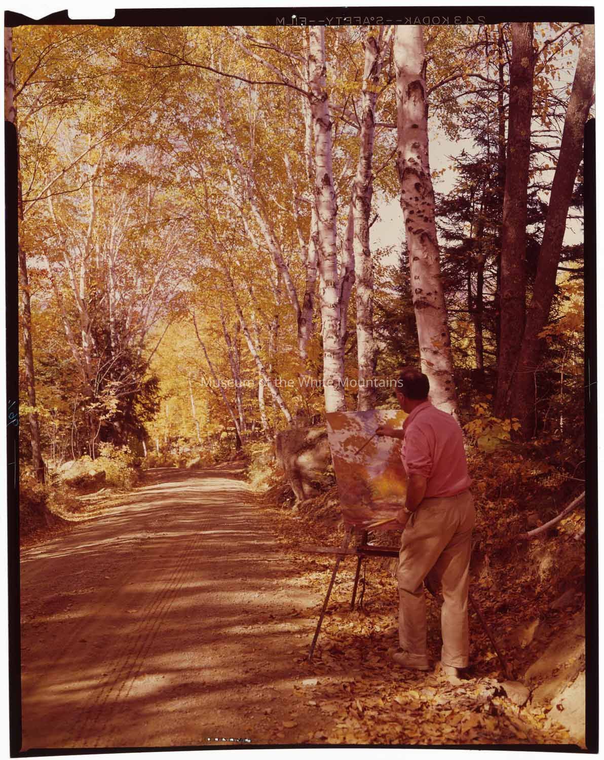 Photo of an unidentified dirt road surrounded in Jackson NH. The road is surrounded on either side by birch trees with bright yellow leaves. Standing on the right side of the road is a man standing with an easel and large canvas, painting an autumn scene.Collection