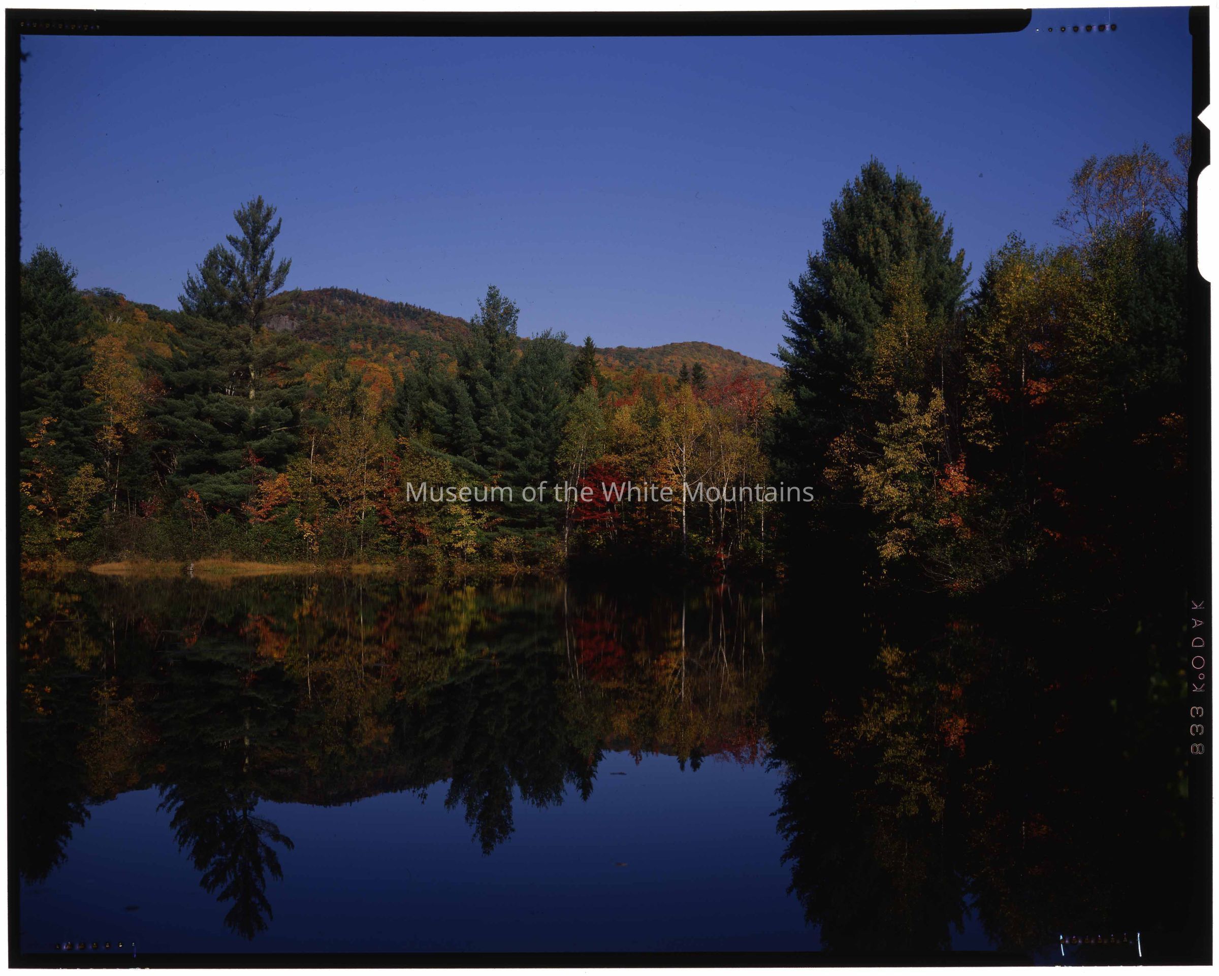 View of a lake surrounded by autumn colored trees. The trees around the lake are clearly seen in the reflection on the surface of the lake. Tree covered mountains can be seen in the background.Collection