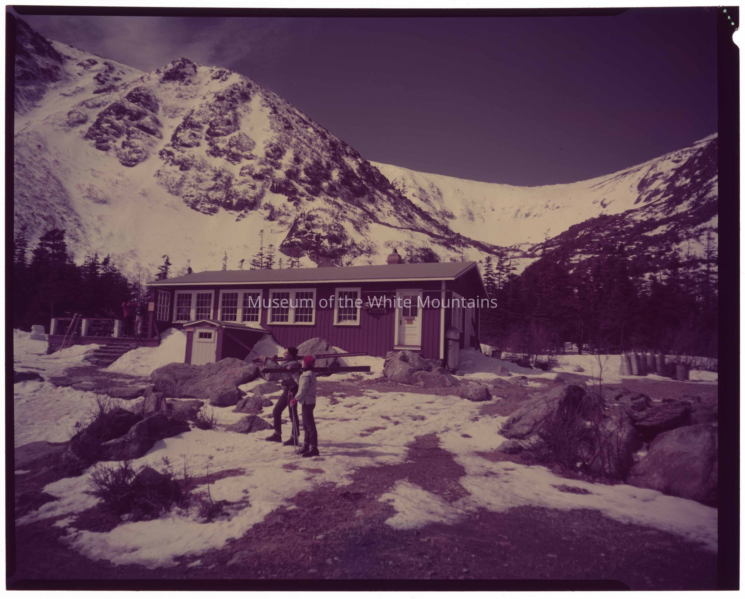 View of Tuckerman Ravine and the caretaker's cabin (HoJo's). The building has a large deck and front porch. Two people are standing in front of the cabin, carrying skis, while another pair is standing on the deck. Off to the right a pile of metal tanks can be seen in the snow.Collection