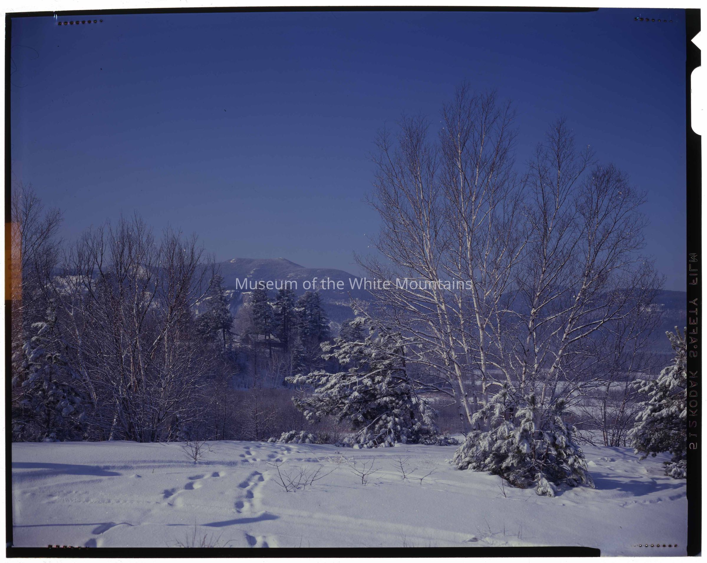 View of a snow covered field with several small pine trees and birch trees. There are two lines of footprints in the snow. Moat Mountain is visible behind the trees.Collection
