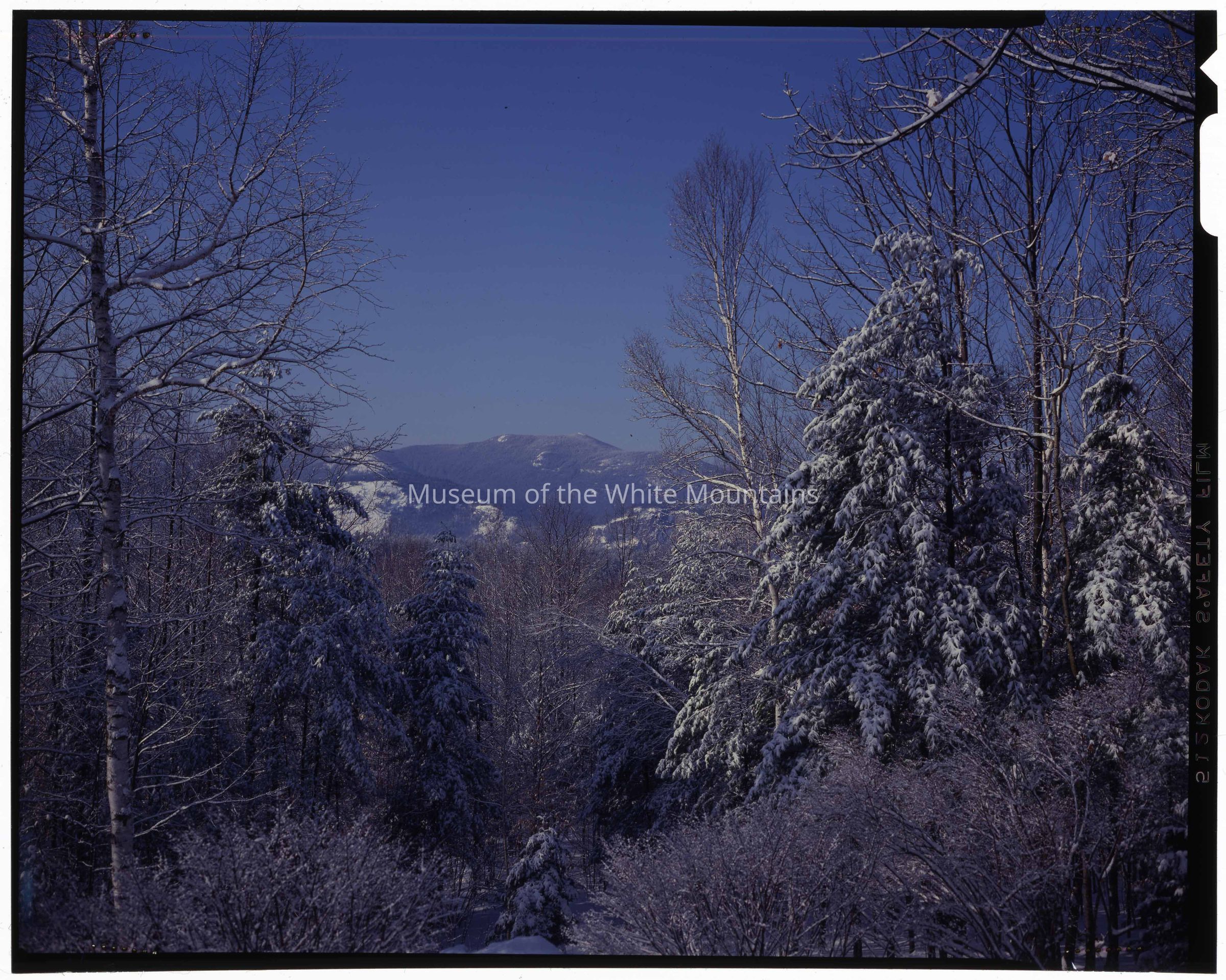 View of Moat Mountain and the ledges, covered in snow. Some of the trees have bare branches. Snow covered mountains can be seen in the distance.Collection