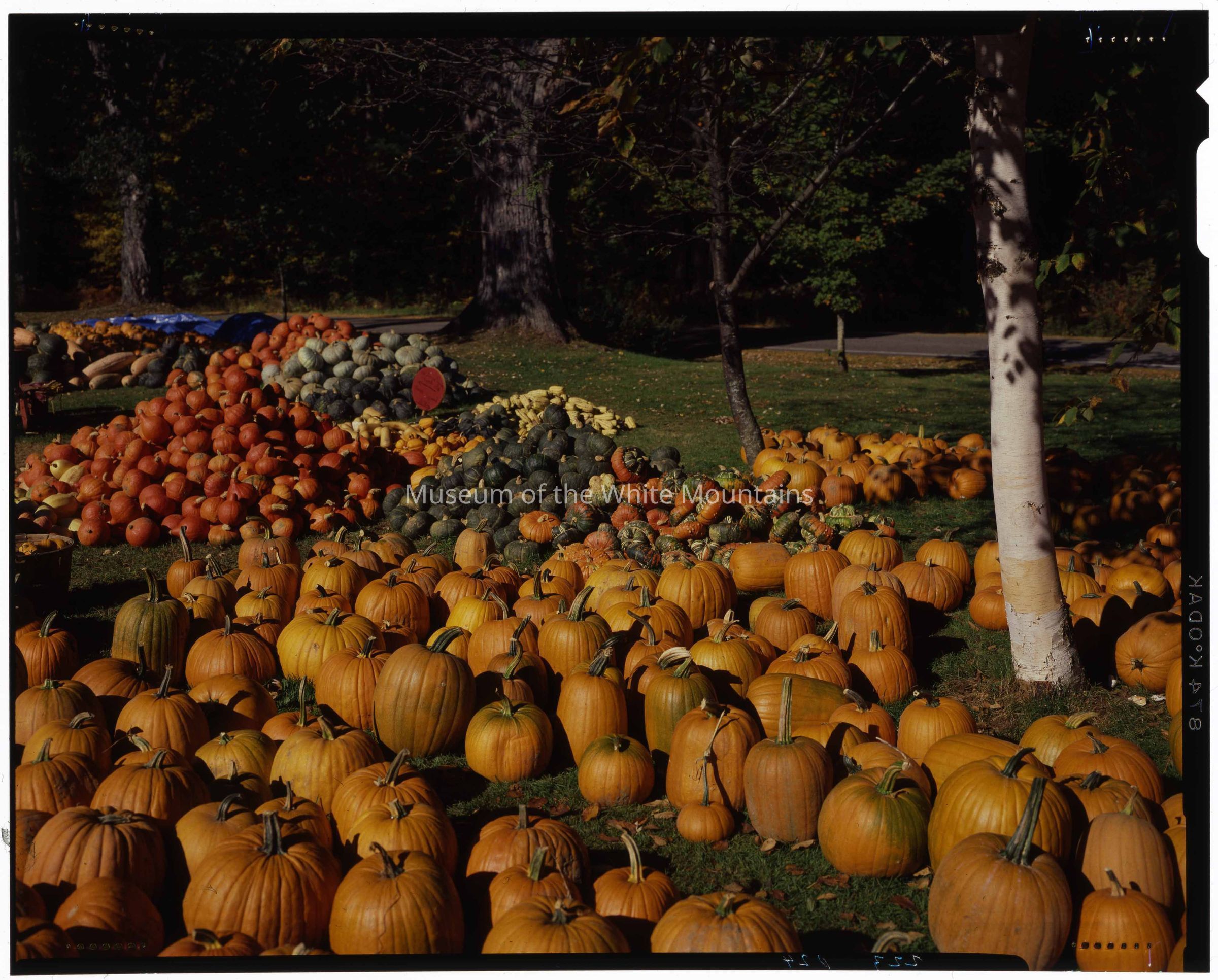 The photo is of piles of pumpkins ranging in sizes and colors. A road is visible in the background; to the left of the road is a blue tarp. There are several trees next to the pumpkin piles.Collection