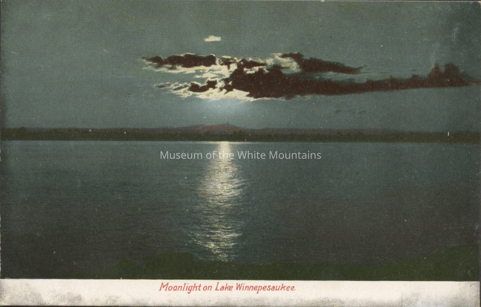 Colored image of a lake at nighttime. Caption reads, “Moonlight on Lake Winnepesaukee.”