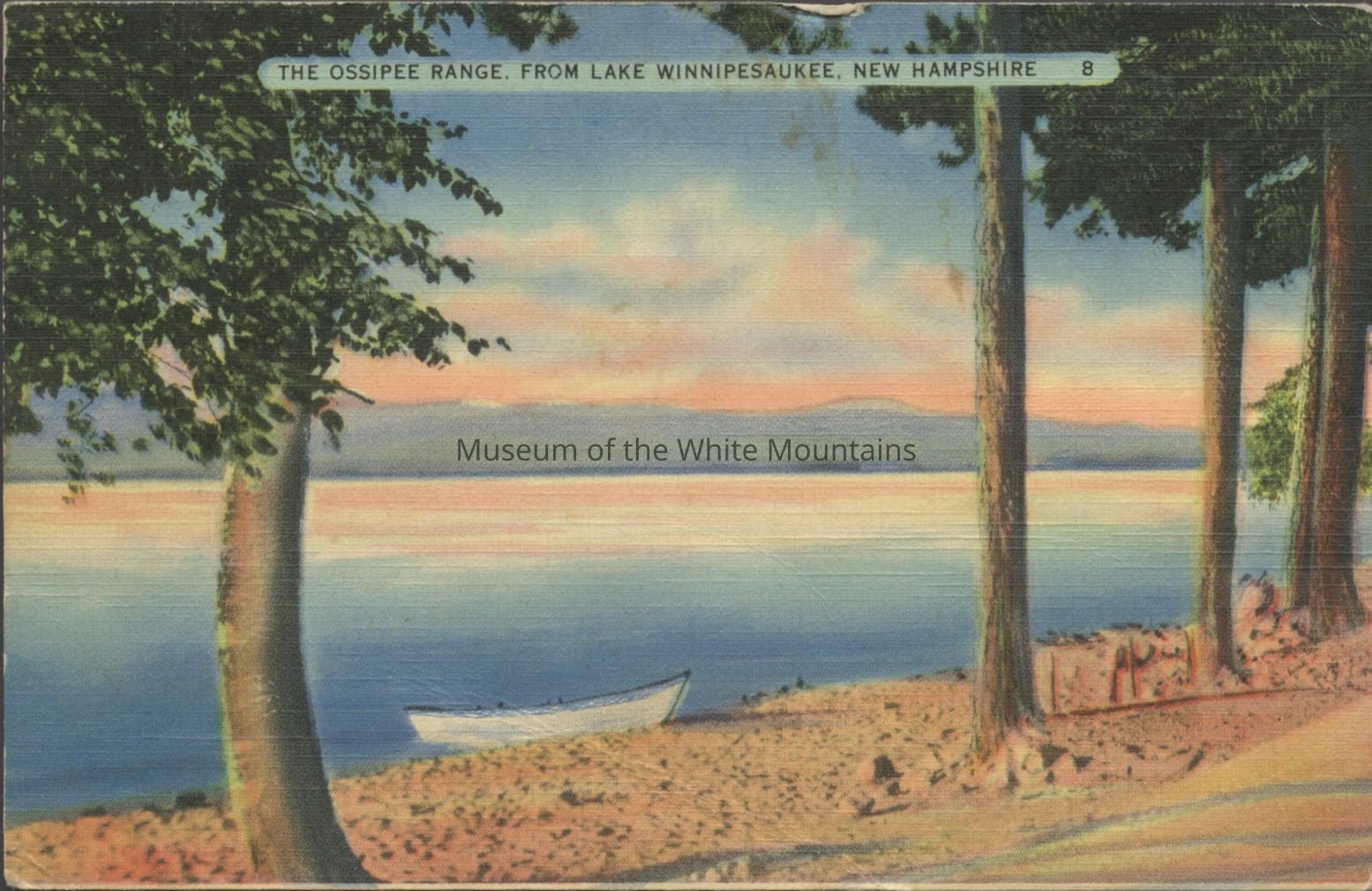 Colored image of a sandy beach with a lake and mountains in the background. Several trees are in the foreground. A canoe is partially in the water. Caption reads, “The Ossipee Range, from Lake Winnipesaukee NH”