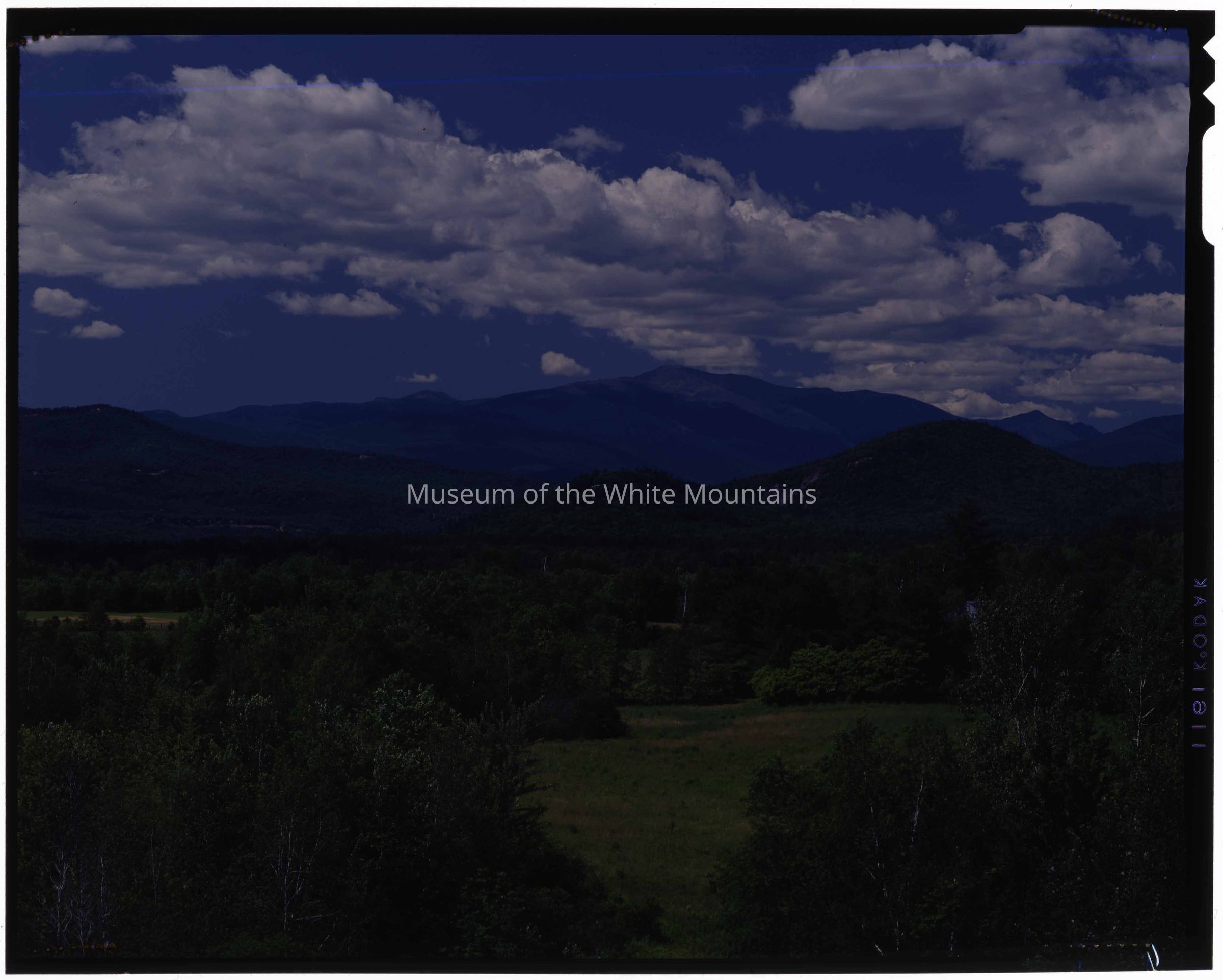 View of Mount Washington from Intervale. Beneath Mount Washington, other mountains can be seen as well as trees and fields. To the left there is a small field with a patch of dirt in the middle. To right, covered by trees, a tiny bit of building is visible.Collection