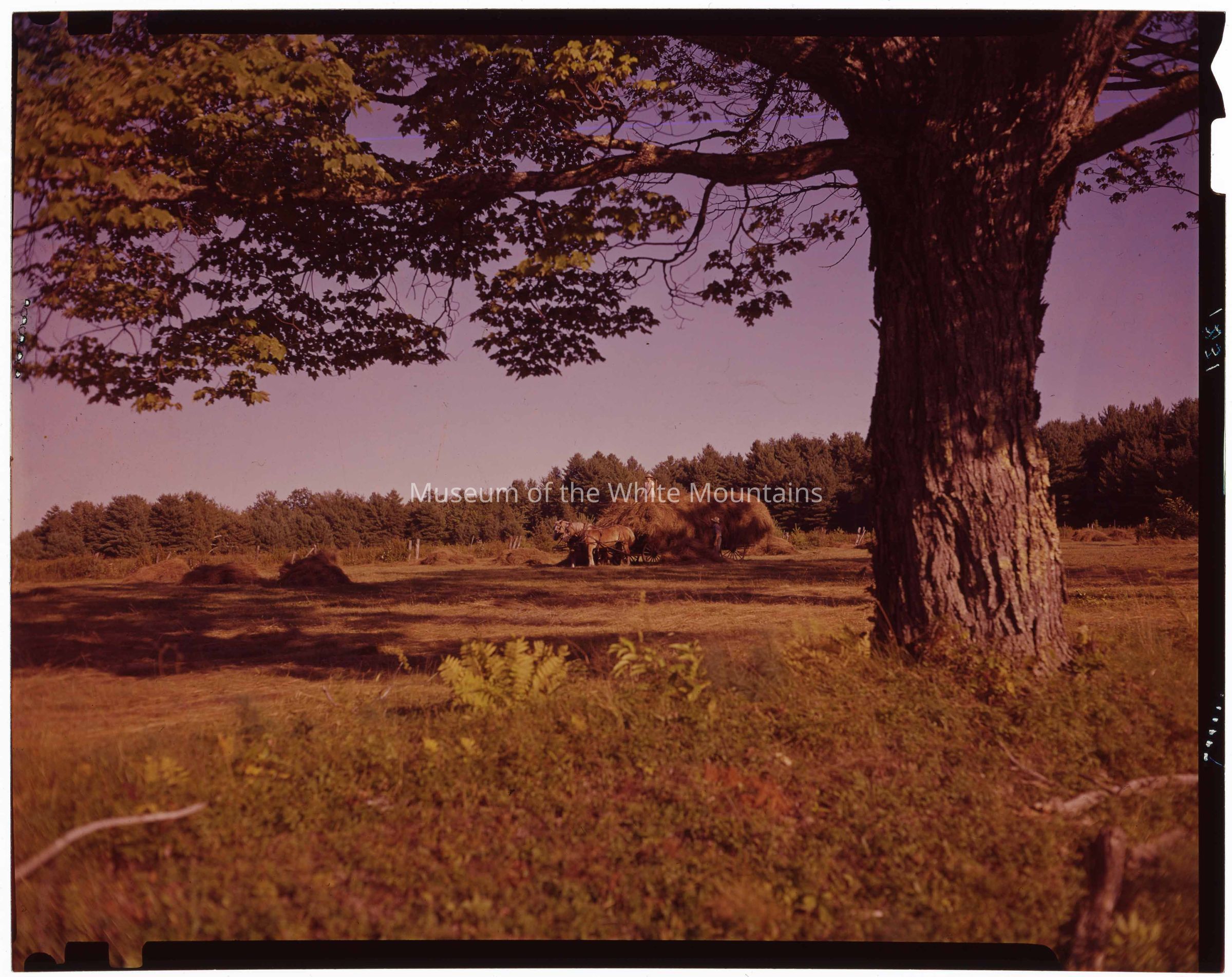 The photo shows two men haying in a field. There are two horses pulling the cart full of hay, with one of the men standing on top of the cart directing the horses. Other piles of hay are seen throughout the field. One large tree stands in the foreground.Collection