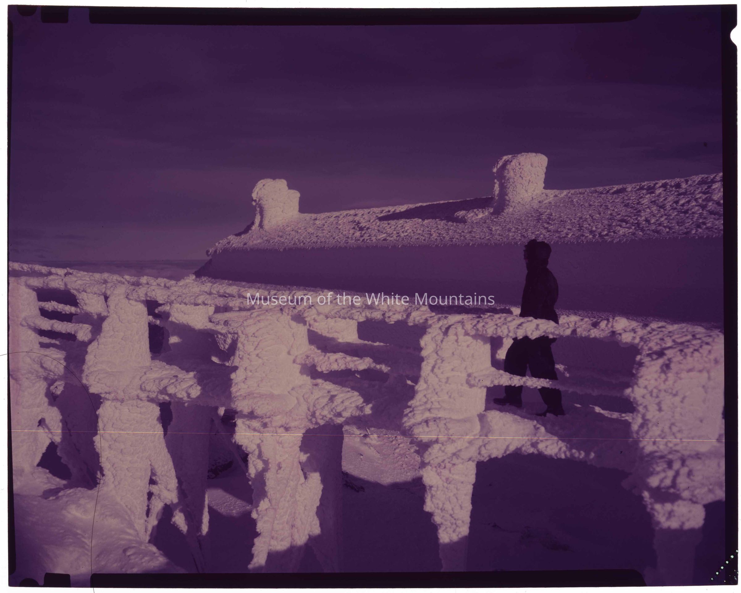 Photo shows a man walking on the summit of Mt. Washington. On either side of him is a fence and building, both are covered with snow and rime ice.The man is dressed in heavy winter clothing.Collection
