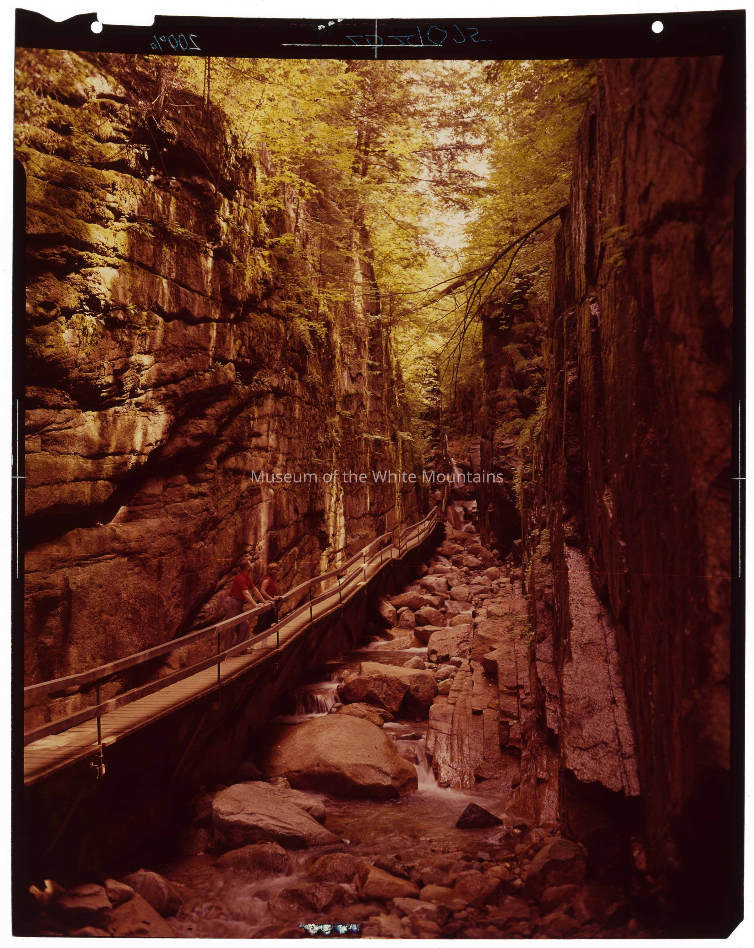 View of the walkway at The Flume in Franconia Notch. Along the bridge, three people can be seen. Two of them are wearing red shirts and the third is climbing the stairs in the background. Rocks and some water are visible below and in front of the bridge. Trees are seen at the top of the gorge.Collection
