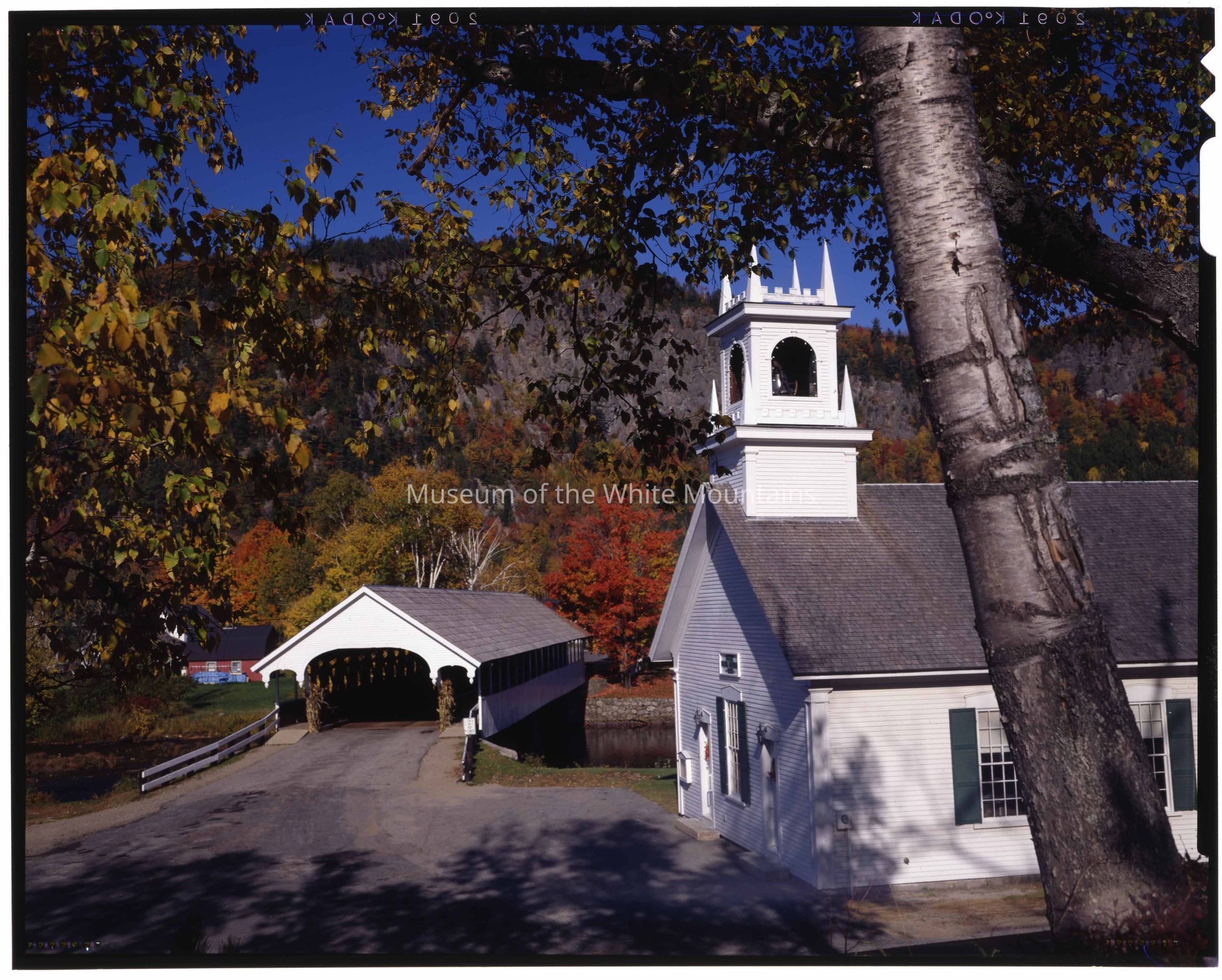 The photo is of a church and covered bridge in Stark, NH. A mountain can be seen behind the covered bridge. There is a house behind the bridge to the left. The leaves on the trees have changed color or have fallen. The church has green shutters and a bell tower. Pavement runs in front of the church and across the bridge.Collection