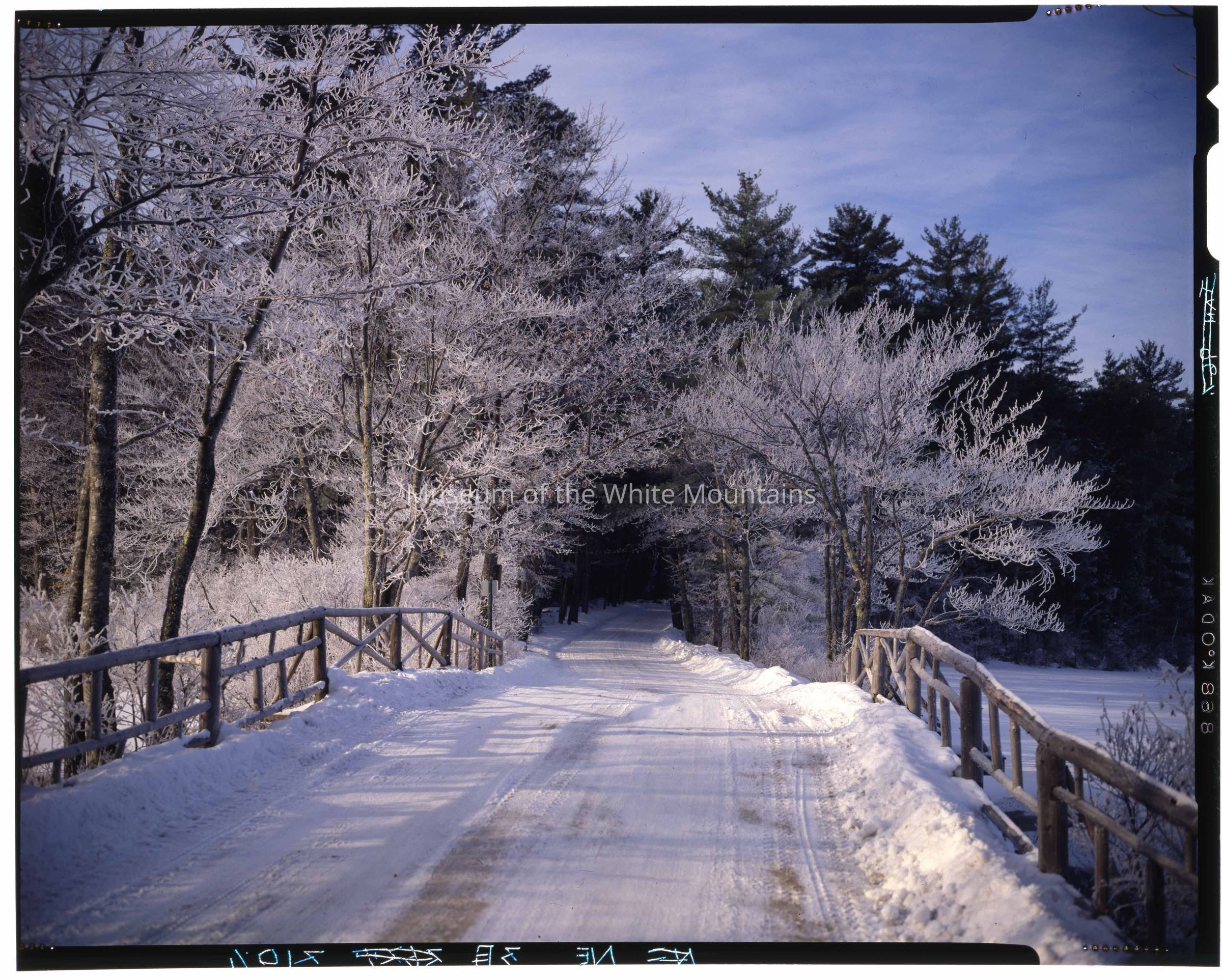 View of the Narrows Bridge, located at the south end of Chocorua Lake, which crosses over the outlet into Little Chocorua Lake. The bridge is snow covered and surrounded by the frozen lake and snow covered trees. Some tire tracks can be seen in the snow along the bridge.Collection