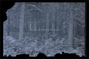 Black and white glass plate negative. The image is of a dense forest, and the tree in the foreground has no leaves on it. The ground is littered with tall ferns.
