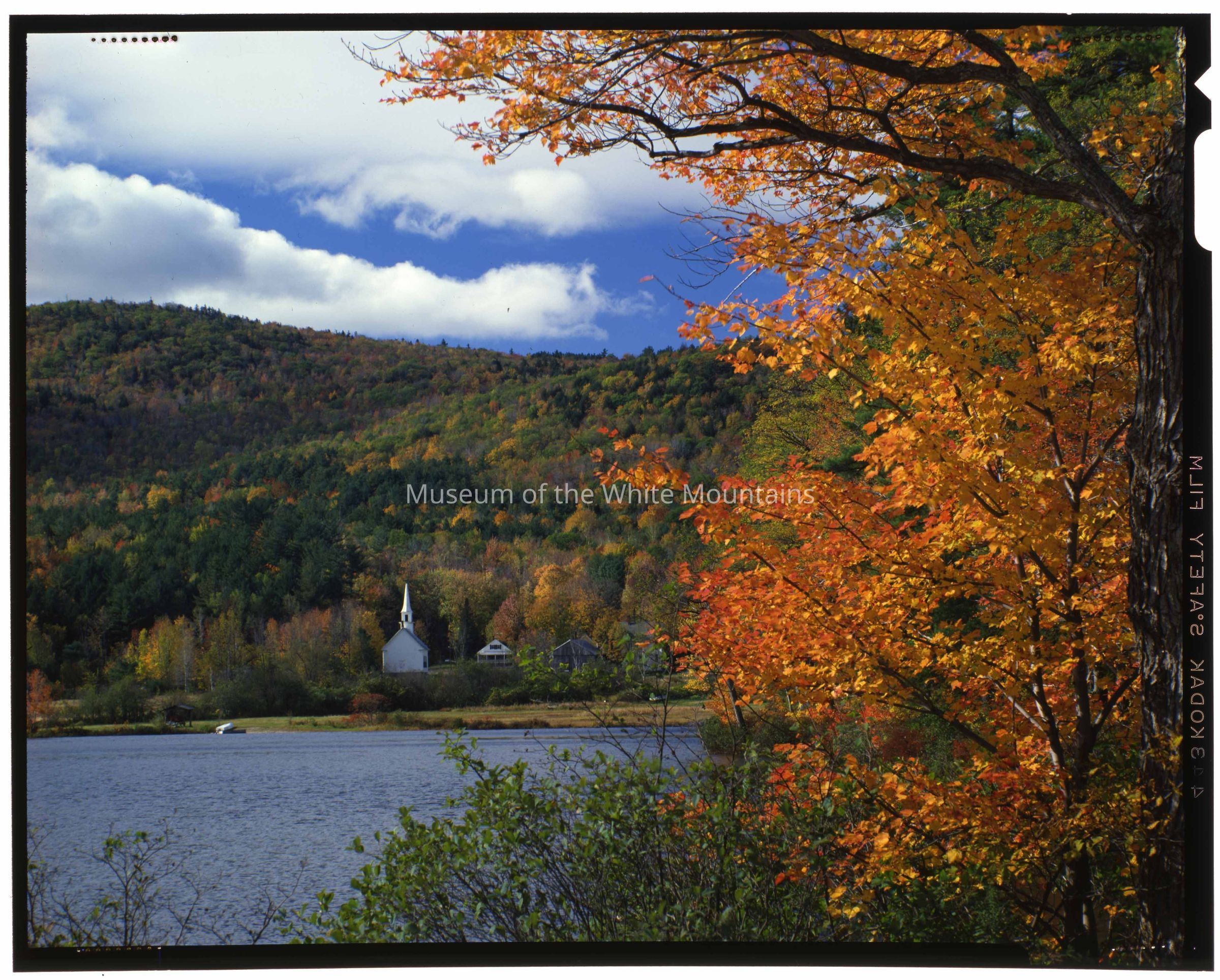 View of Crystal Lake in Eaton, NH taken in the fall. Beyond the lake, a white church and steeple and a few other buildings are visible. Behind the buildings there is a hillside. The leaves on the trees are just beginning to change color.Collection