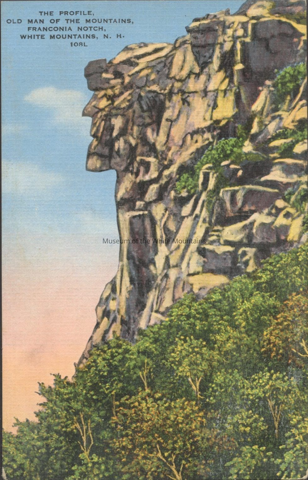 Colored image of a rocky mountain with formation of a face in the side. Caption reads, “The Profile, Old Man of the Mountains, Franconia Notch, White Mountains NH.”