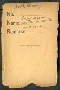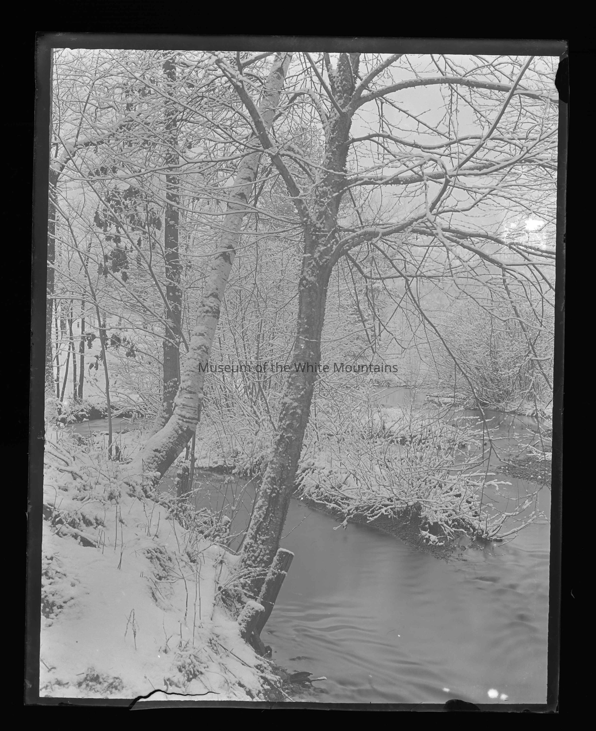 Black and white glass plate negative. This image depicts a snowy scene of a small stream and several trees leaning over the riverbank. There is a small island in the middle of the stream that divides its flow before reconnecting. The original paper sleeve gives it the title "Snow Scene with Tree in Center and Brook" as well as the location of North Conway.