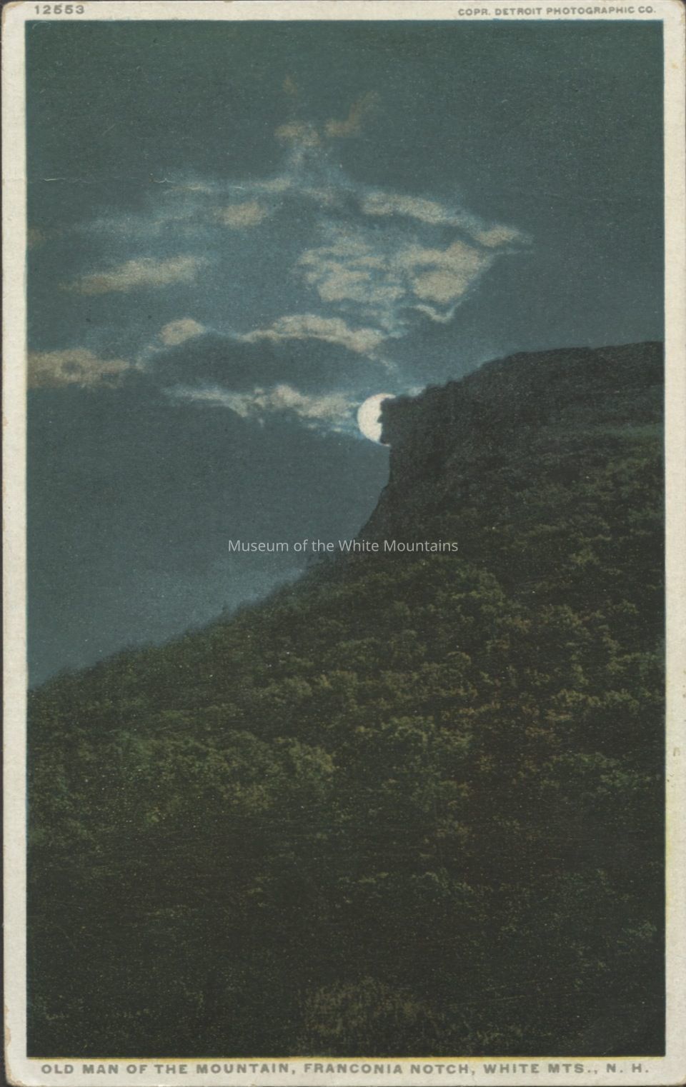 Colored image of a rocky mountain with a rock formation on it at nighttime. Caption reads, “Old Man of the Mountains, Franconia Notch, White Mts NH.”