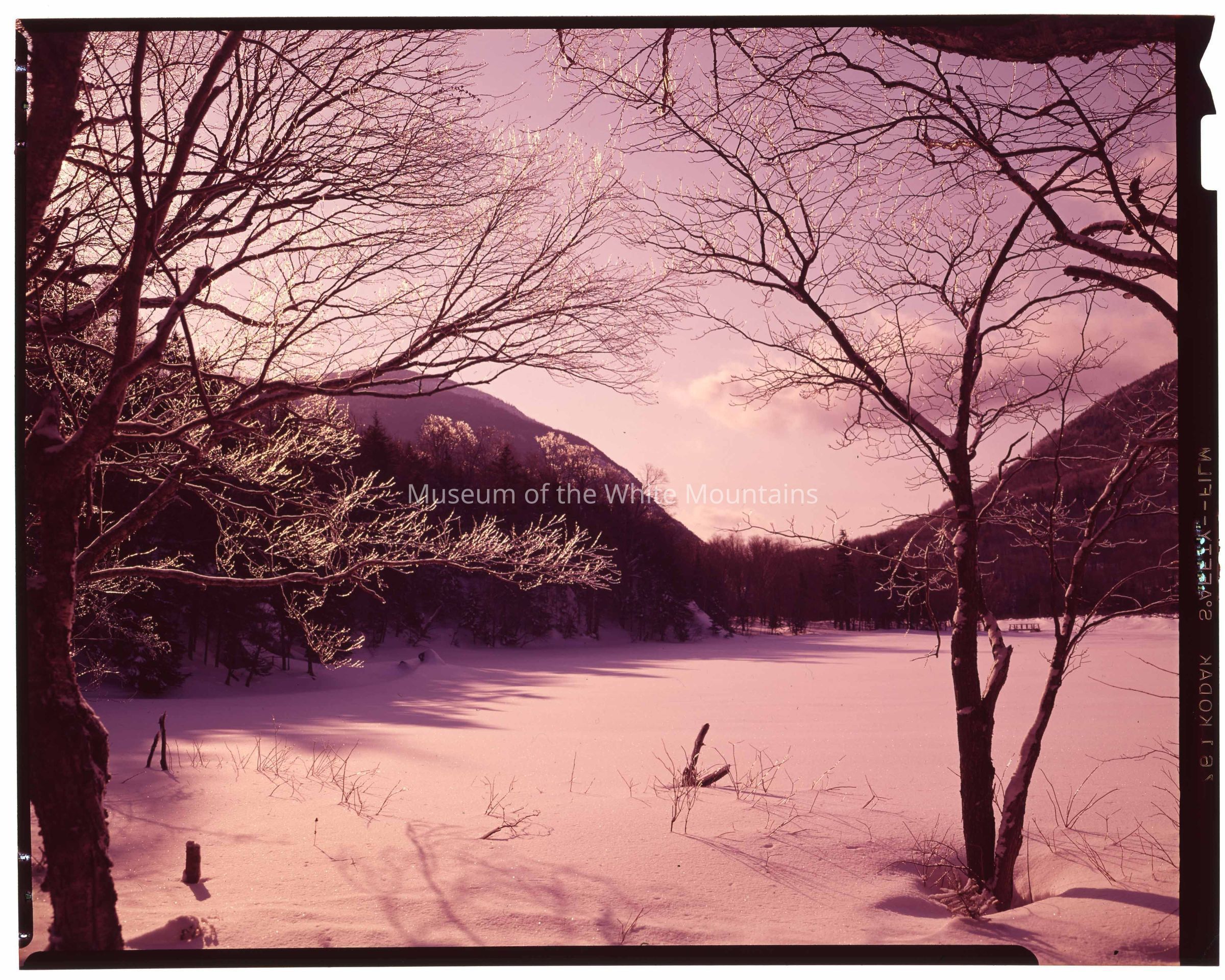 The photo is of a snow covered landscape in Crawford Notch. The ground is sparkling in spots an appears to be a lake or pond covered in snow. Trees and mountains surround the area. Ice can also be seen on the tree branches.Collection