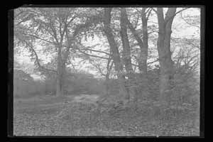 Black and white glass plate negative. This image is of a dirt road between a group of trees. There are bushes around the trees and a denser patch of trees in the background.