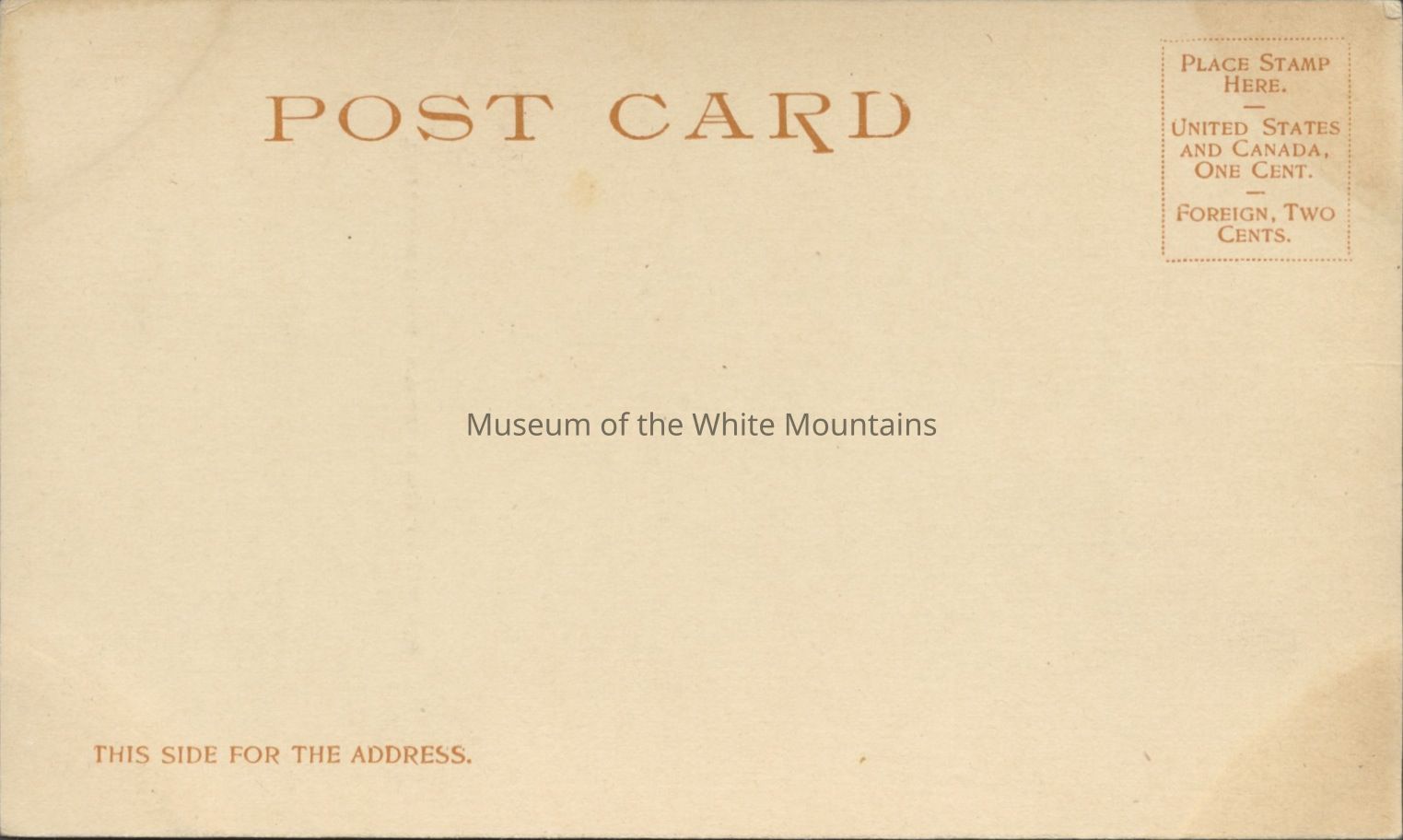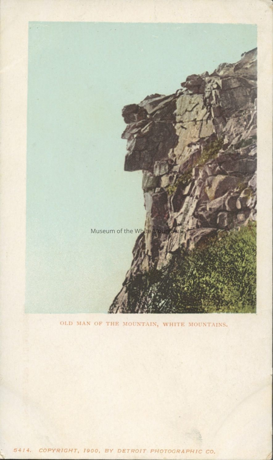 Colored image of a rocky mountain with a rock formation on it. Caption reads, “Old Man of the Mountains, White Mts NH.” Back Description: Typical postcard back.