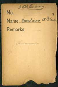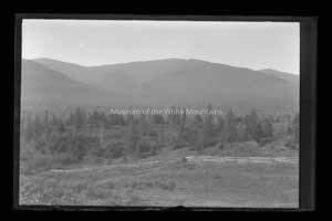 Black and white glass plate negative. This image contains a far away view of the mountains in North Conway. In the foreground there is a small forest of trees, a fence and a field. The original paper sleeve gives it the title "Mountains at Glenn" and the location of North Conway.