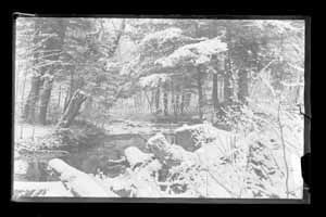 Black and white glass plate negative. This image was taken during the winter time and is of a stream bed. There are trees surrounding it, and the foreground of the image has some cut down logs and bushes. The stream itself does not appear to have ice on it.