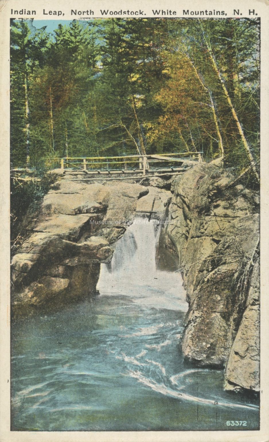 Colored image of a waterfall among rocks and trees with a bridge running over it. Caption reads, “Indian Leap, North Woodstock White Mts, NH.”