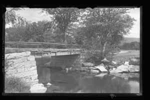 Black and white glass plate negative. This image shows a small bridge over a shallow body of water. The base of the bridge is made with slabs of rocks and the bridge itself is made of wood and logs. There are trees on the far side of the bridge and behind it. Also behind it is a field, a small forest and a mountain far off in the distance. The original paper sleeve gives the title "Bridge Trail Common" written in pencil.