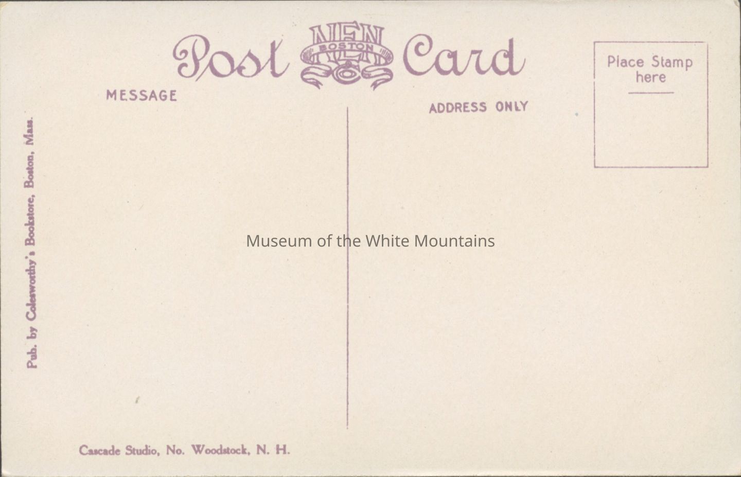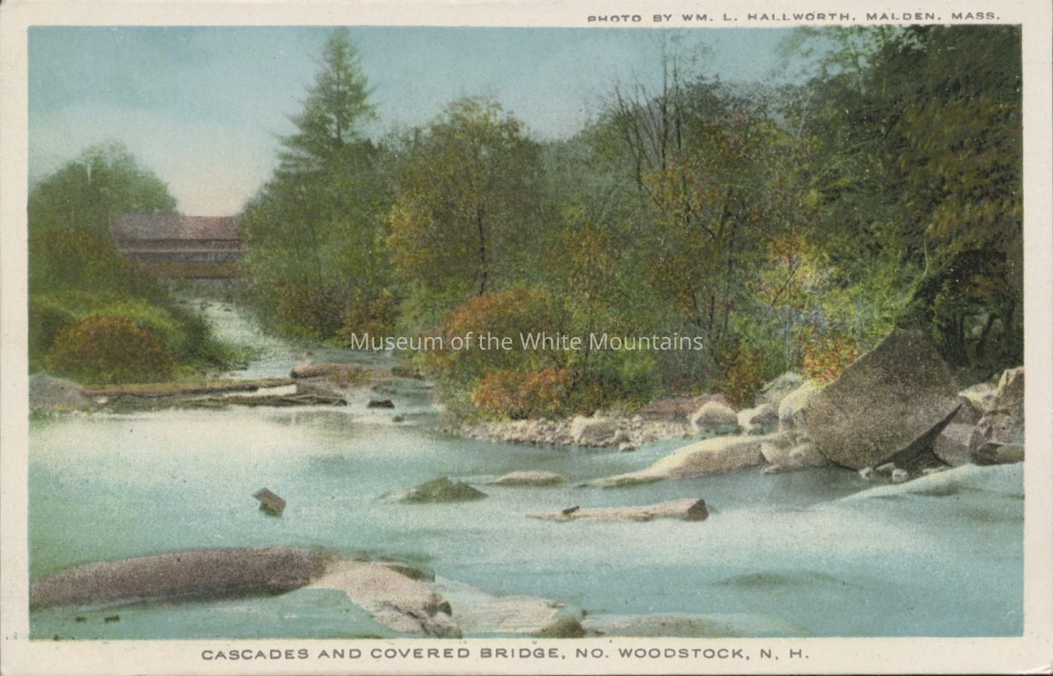 Colored image of a rocky river with a covered bridge running over it. Caption reads, “Cascades and covered bridge, No Woodstock NH.”