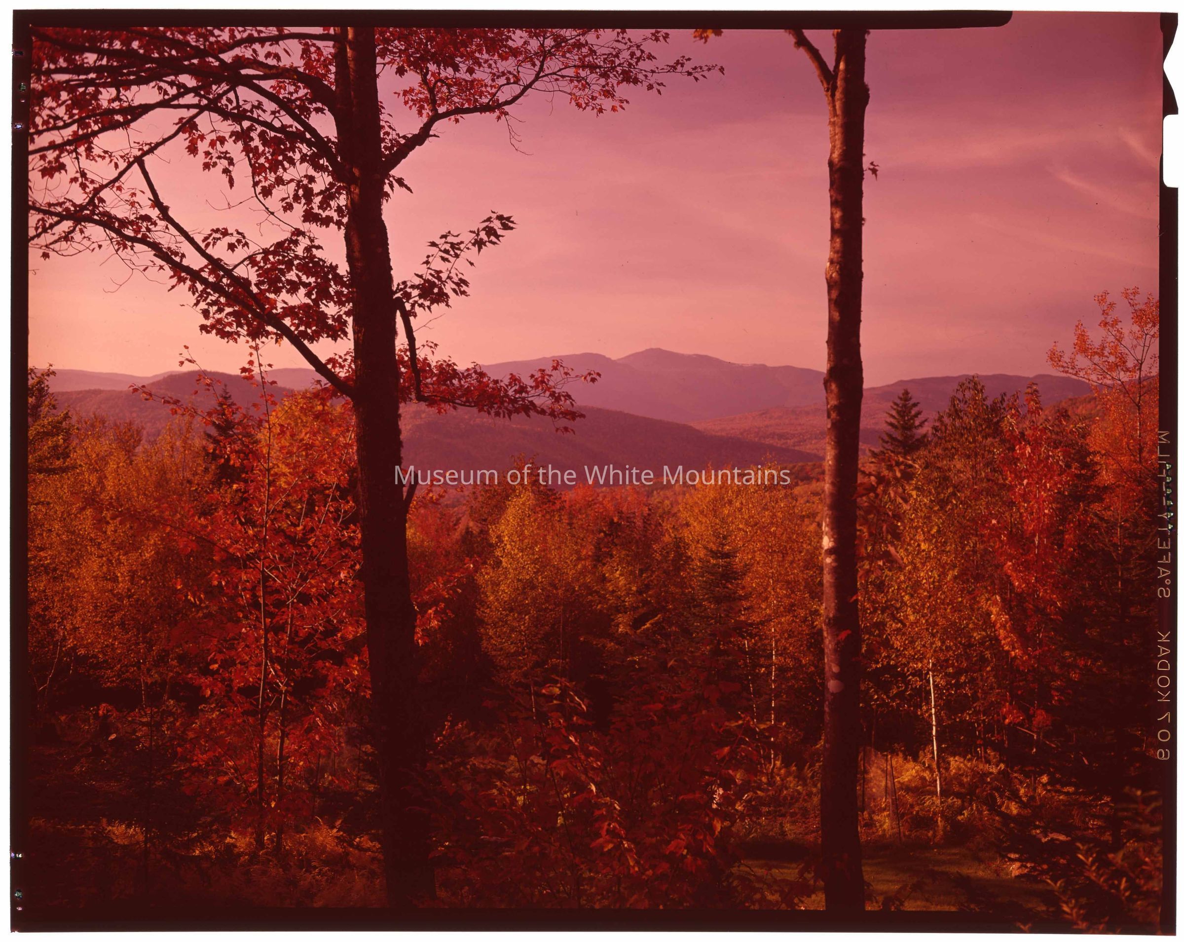 The photo is a view of Mt. Washington from Jackson, NH, with two trees in the foreground. The trees all have red, yellow, and orange leaves. Other mountains can be seen surrounding Mt. Washington.Collection