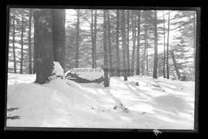 Black and white glass plate negative. This image shows a snowy winter scene in a the woods. There are many trees about and yet the area is still rather open to sunlight. There is one rock a little left of the center of the image. The original paper sleeve has illegible handwriting in pencil, and the month, June.