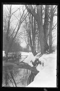 Black and white glass plate negative. This image depicts a winter scene of a small brook with some trees beside it and a line of trees in the background.