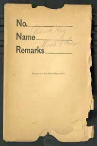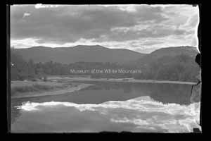 Black and white glass plate negative of Moat Mountain and Saco River. It is a cloudy day but the sun is shining through a little. The edges of the river are surrounded by trees and there is a short beach at the edge of the water. Written on the original paper sleeve is "Reduced neg" and "Moat and Saco."