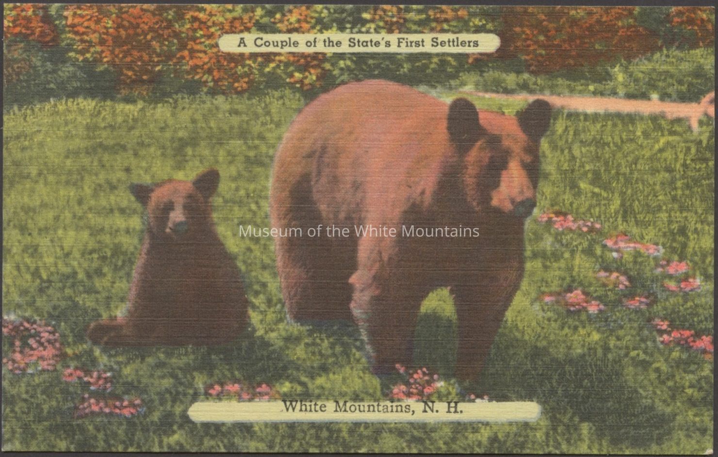 Colored image of two brown bears in a clearing. Caption reads, “A couple of the state's first settlers, White Mountains NH.”