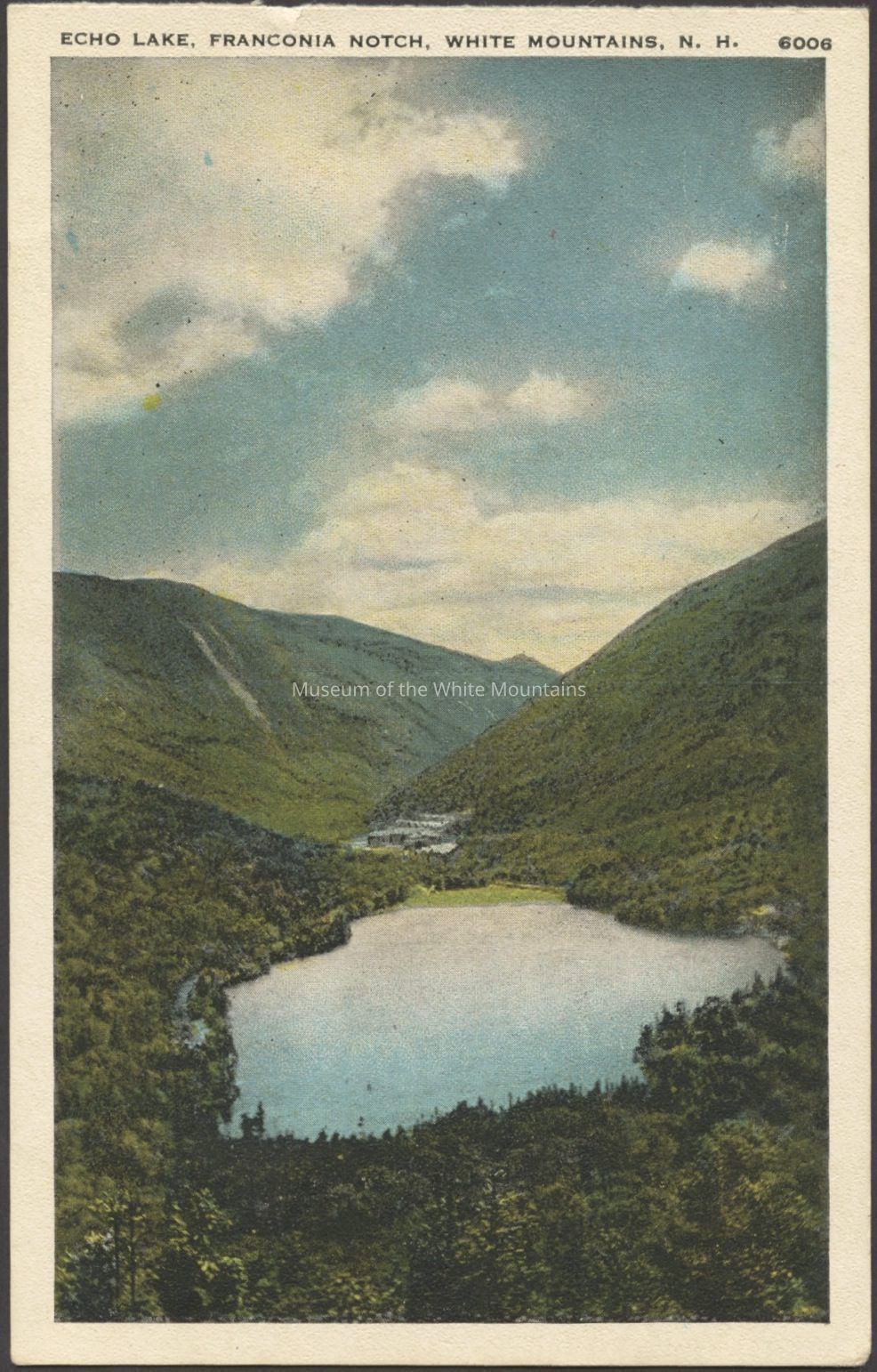 Colored birds-eye view of a lake with mountains around it. Buildings are in the distance. Caption reads, “Echo Lake, Franconia Notch, White Mountains, NH.” Back Description: Typical postcard back.