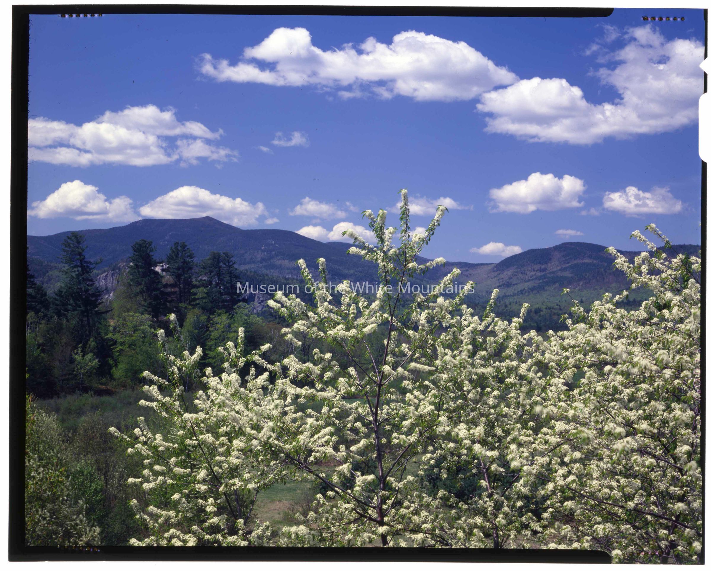 The photo is of a view of Moat Mountain in Intervale. In the foreground is a tree covered with white flowers. Off to the left, other trees can be seen below Moat Mountain.Collection