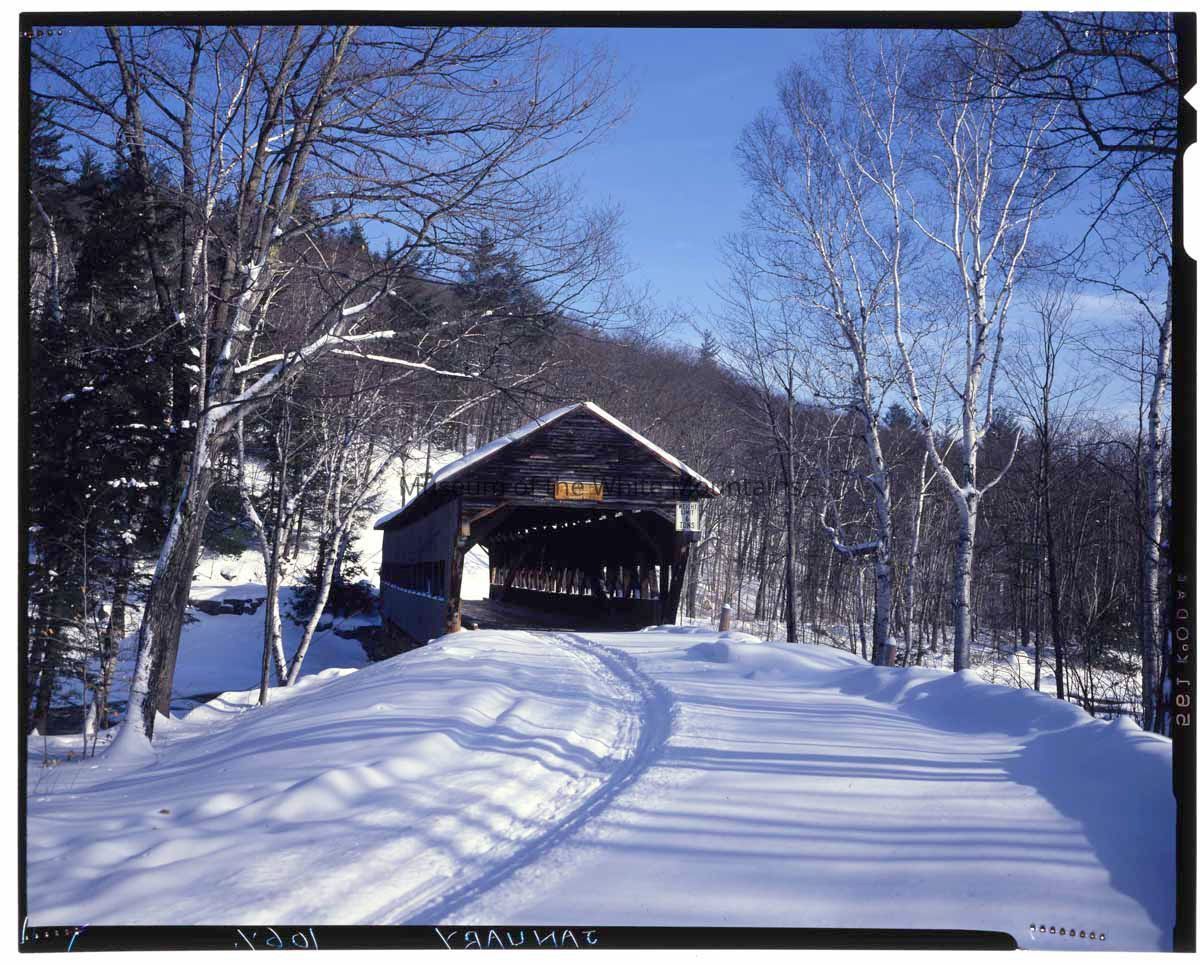 Covered bridges, Mountains, Rivers, Rocks, Signs, Snow, TreesSearch Terms