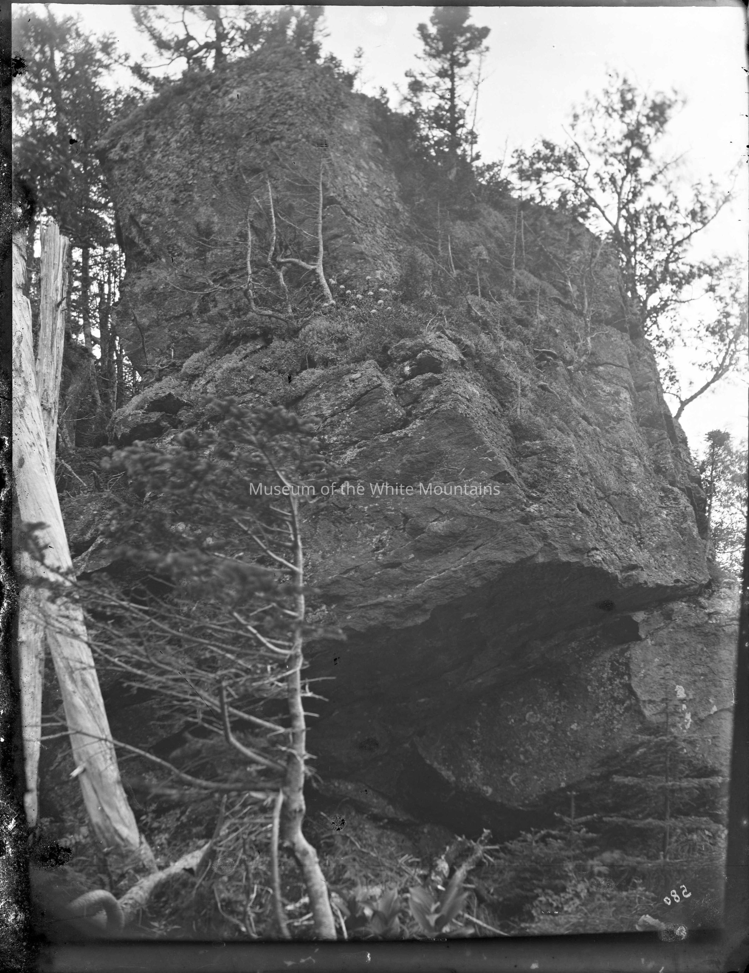 Image of large rock angling to the left with trees and shrubs growing off it. Three dead trees in the foreground. Subject of image unknown but possibly taken in North Conway, the location of White's studio and where many of his photographs were taken.