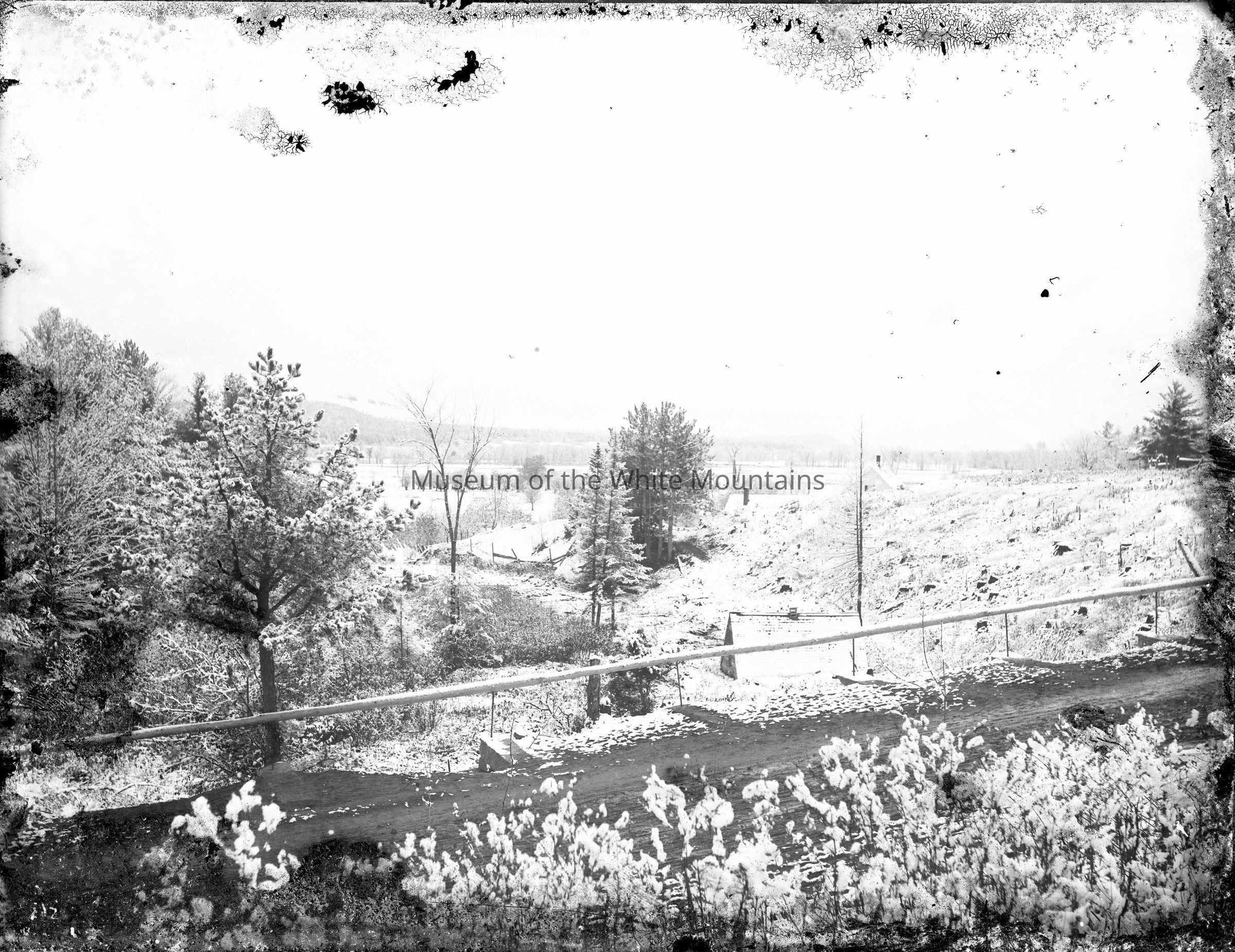 A snowy scene, including the roof of a house or other building in the middle ground of the right third of the image. Two other roofs can be seen in the background. There are trees on the left side of the image and a field or other cleared area on the right. The foreground includes some shrubbery and a dirt road that runs diagonally upward toward the right. There appears to be a fence separating the road from the field, trees, and buildings beyond. Subject is unknown.
